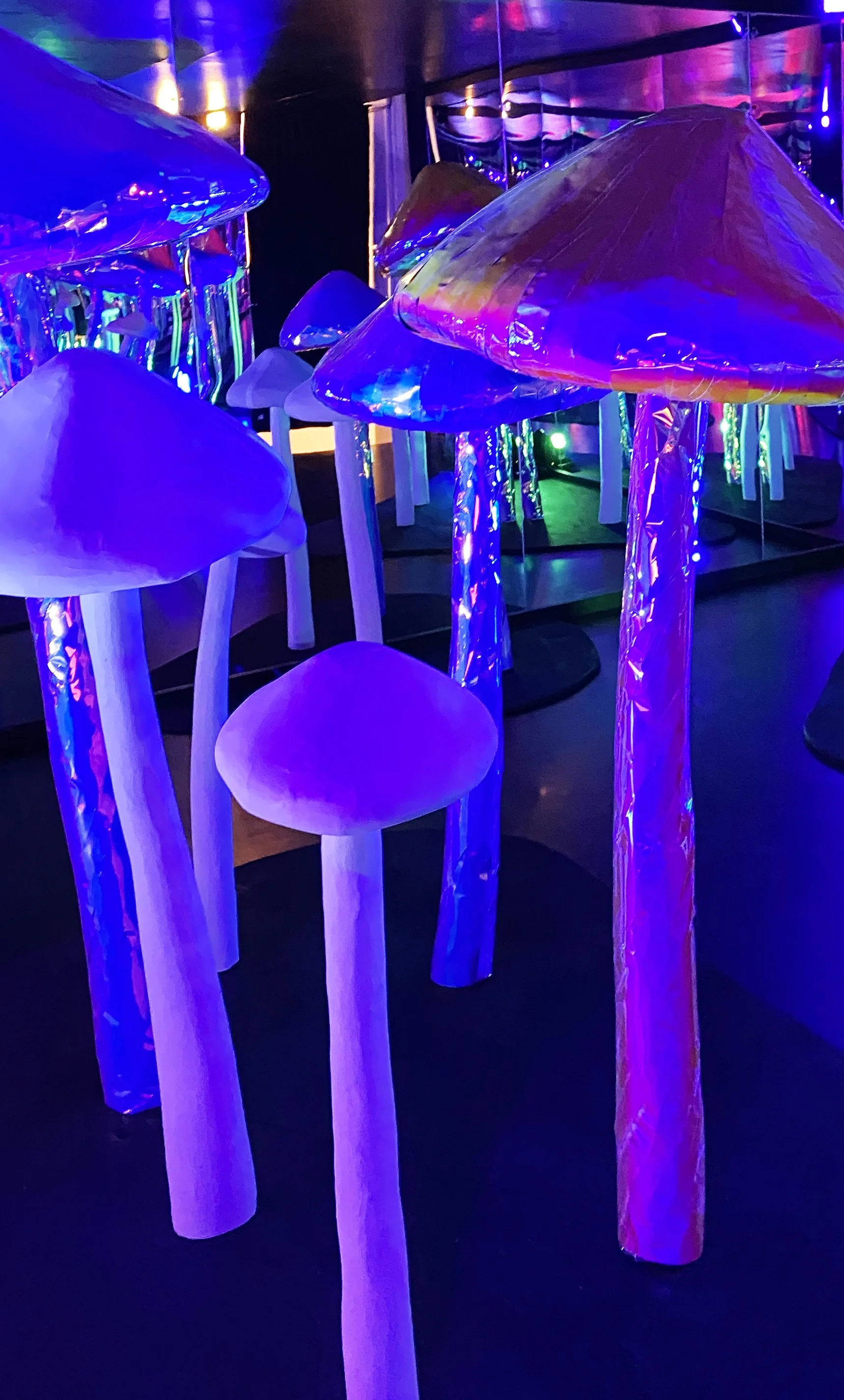 ‘The Shroom Room’ is an immersive installation consisting of larger-than-life mushrooms that create the illusion of wandering through an infinite color-changing psilocybin forest. This installation is inspired by the role that mushrooms can play in our lives, a space to challenge our perspective, for self-reflection, discovery & growth.